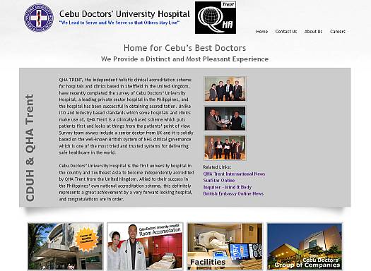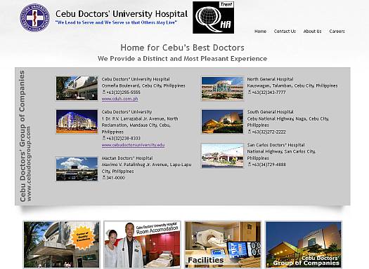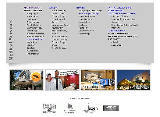 This is the corporate site of Cebu Doctors' University Hospital, one of several hospitals in Cebu City, Philippines. It is an XHTML/CSS site using JQuery accordion effect on the graphical menu and image slider at the bottom.