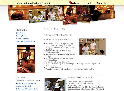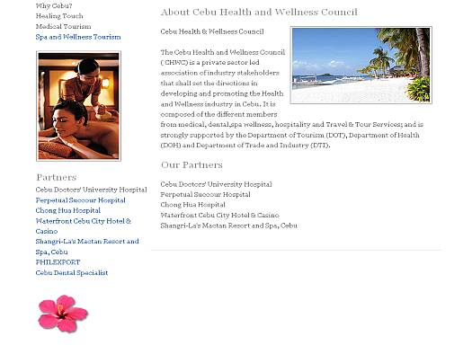 The Cebu Health and Wellness Council (CHWC) is a private sector led association of industry stakeholders that shall set the directions in developing and promoting the Health and Wellness industry in Cebu. It is composed of the different members from medical, dental,spa wellness, hospitality and Travel & Tour Services; and is strongly supported by the Department of Tourism (DOT), Department of Health (DOH) and Department of Trade and Industry (DTI).